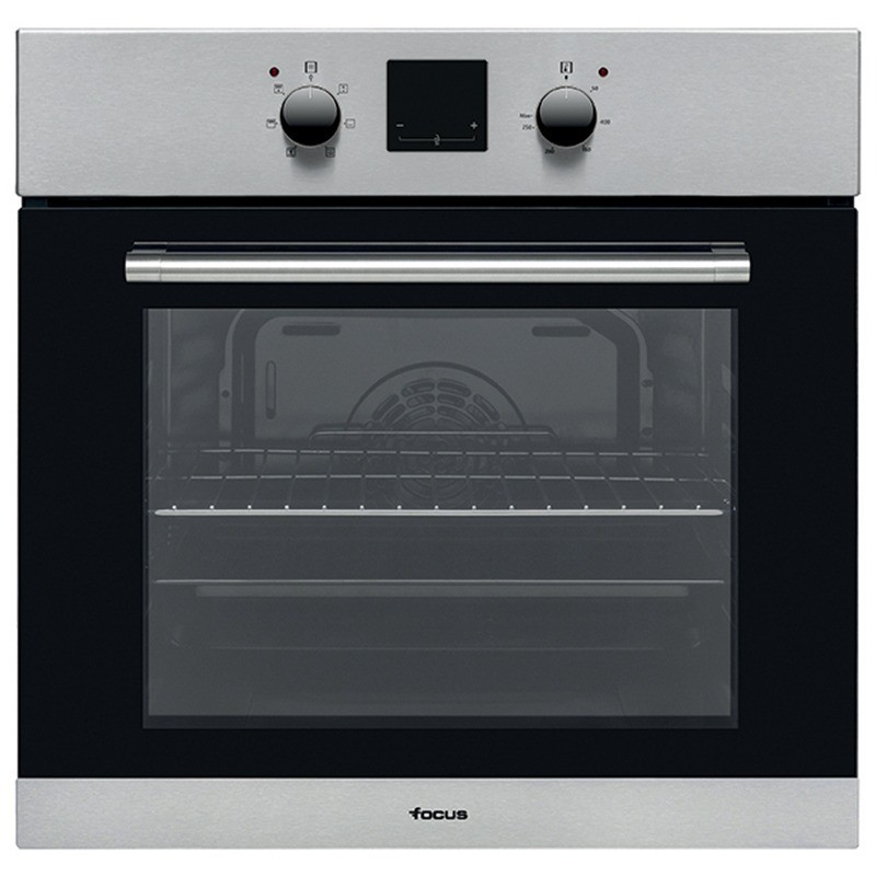 Four Encastrable Électrique FOCUS - Volume: 56 Litres - Largeur: 60 cm - Classe Energétique: A+ - 7 programmes - Chaleur tournante - Porte 2 vitres - Minuterie électronique - Boutons + Afficheur - Porte froide - 1 plateu / 1 grille - Dimensions: 60 x 60 x 53.5cm - Couleur: Inox - Garantie: 2 ans